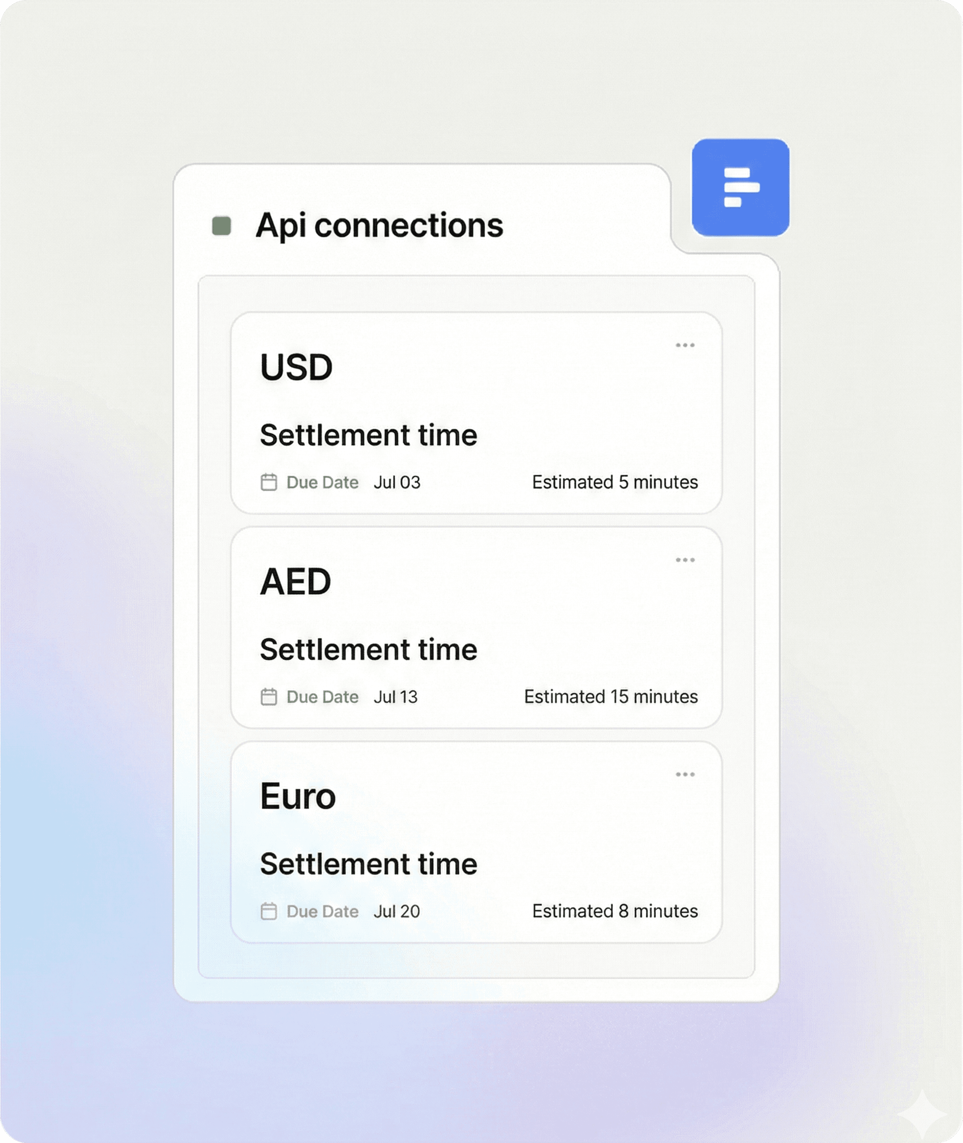 Integrate through a unified integration layer to connect with gateways, virtual accounts, card programs, FX providers, and stablecoin rails via standardized REST endpoints, consistent auth, and webhooks.