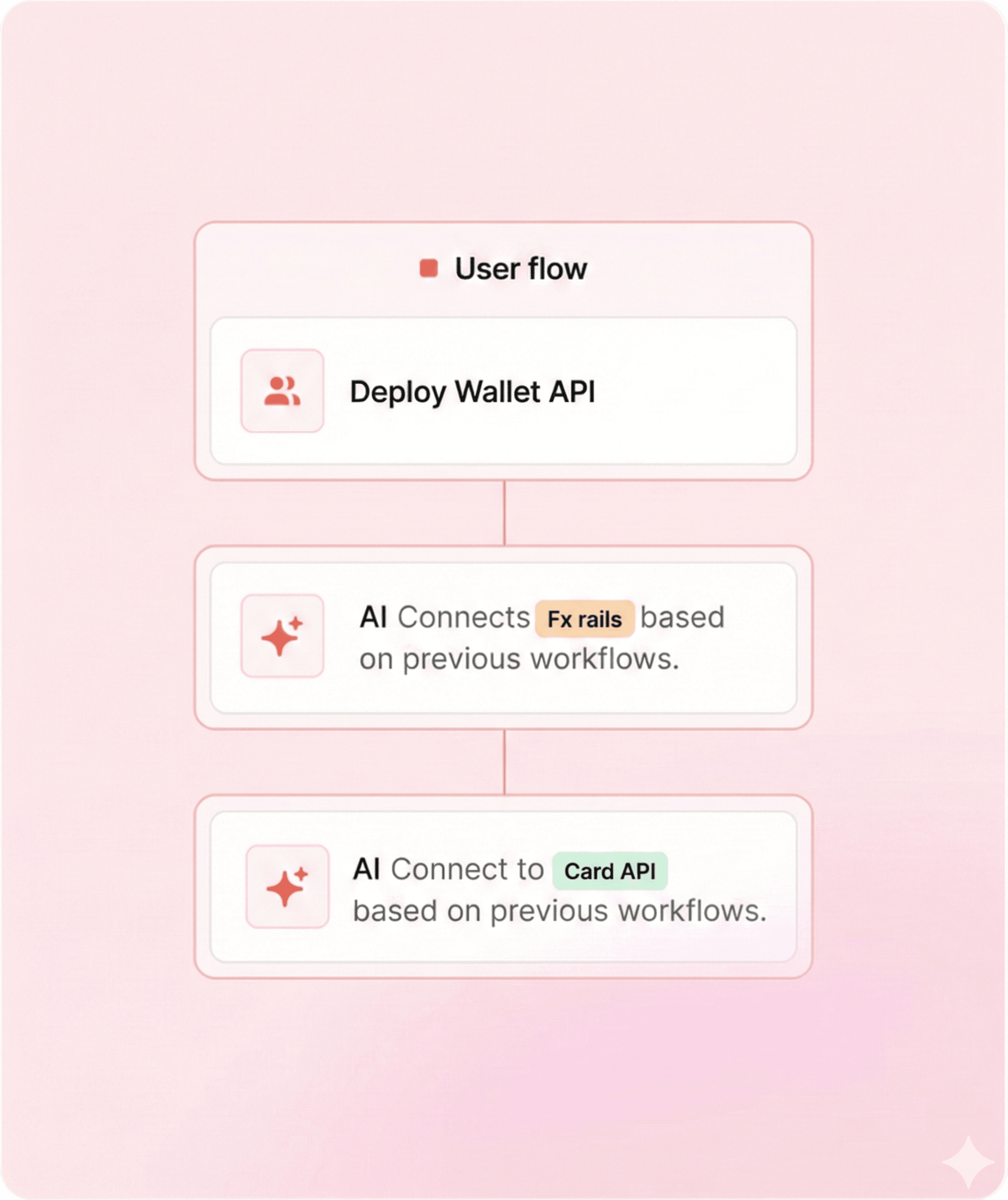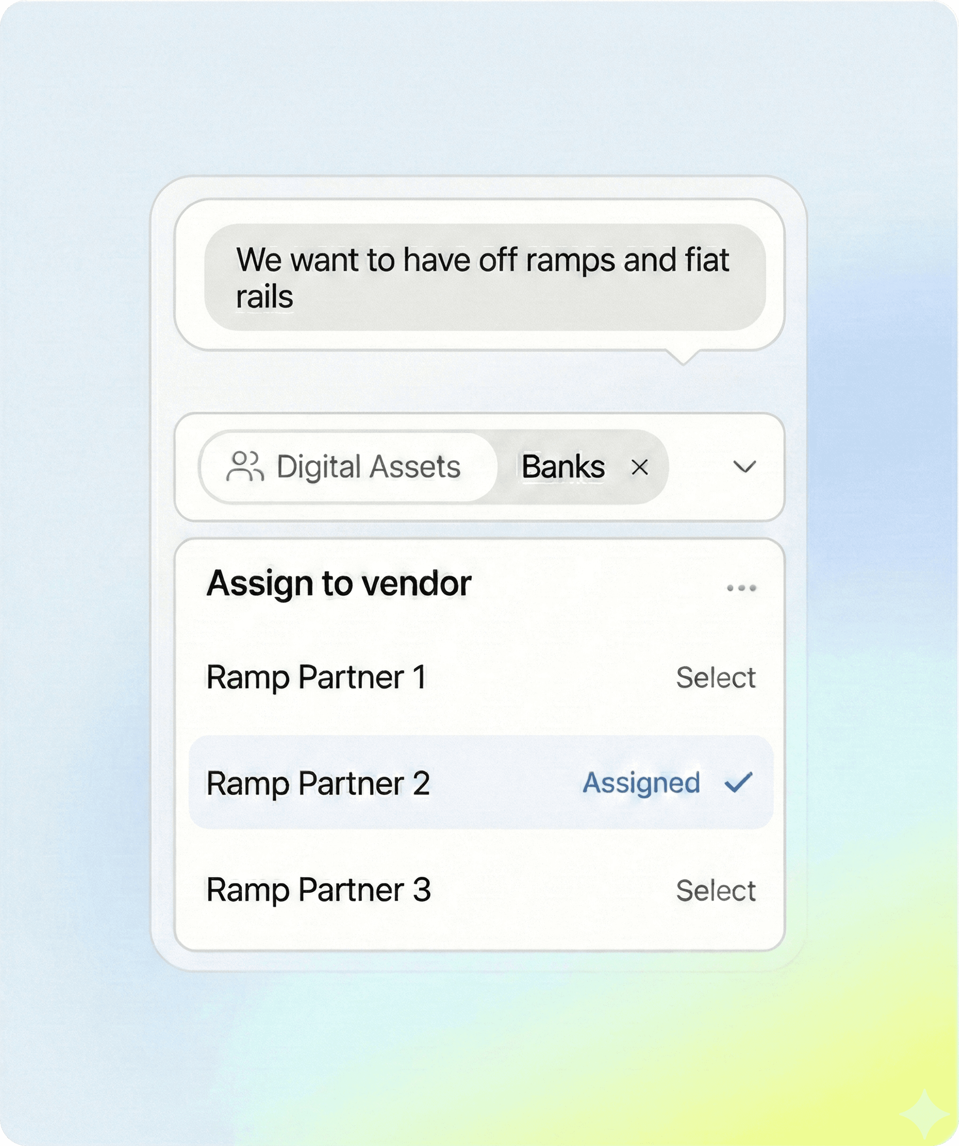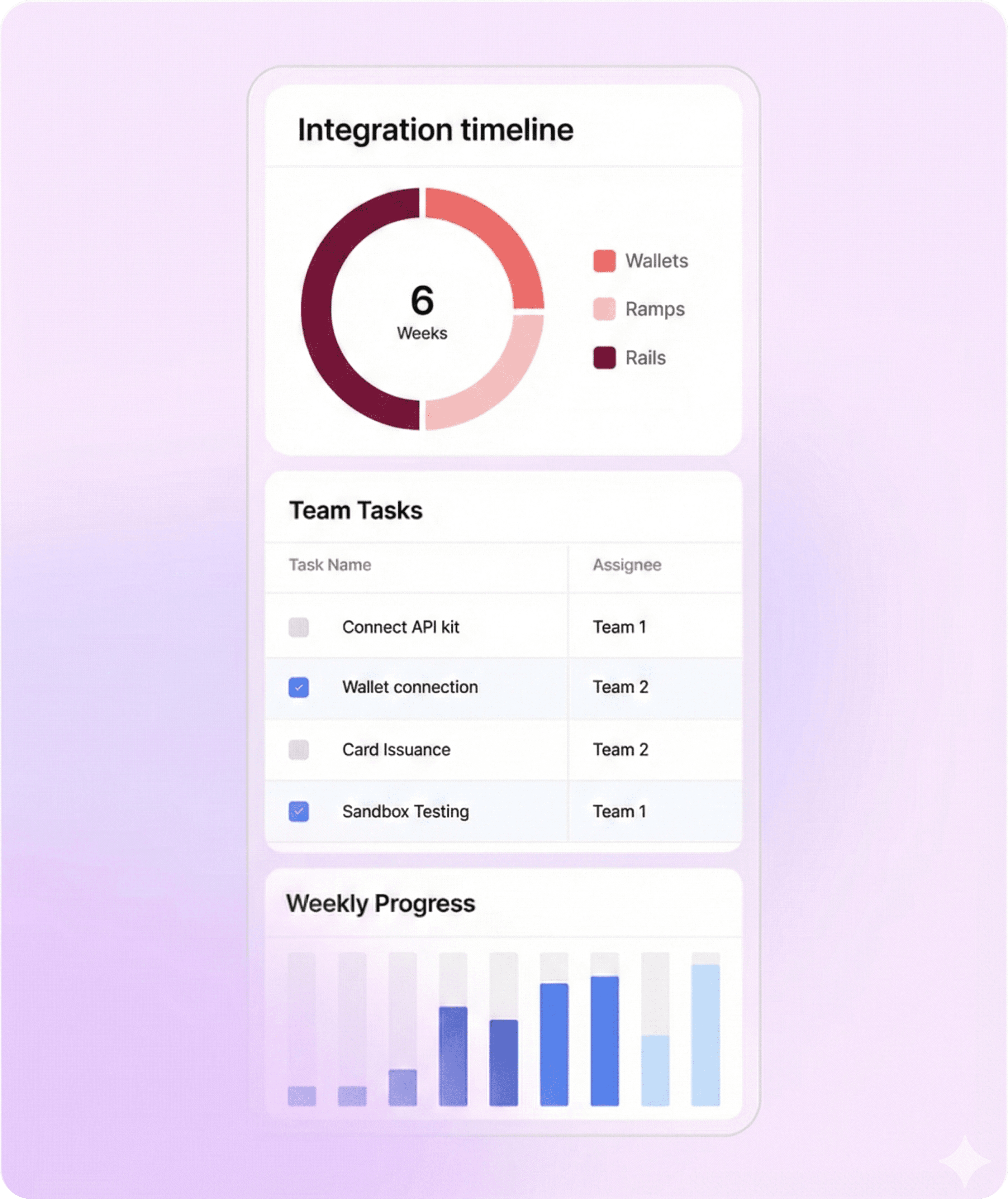Integrate across banking rails, stablecoin networks, and FX providers through a integration layer. Connect to regulated partners for gateways, virtual accounts, card programs, and on/off ramps without managing multiple bespoke integrations.