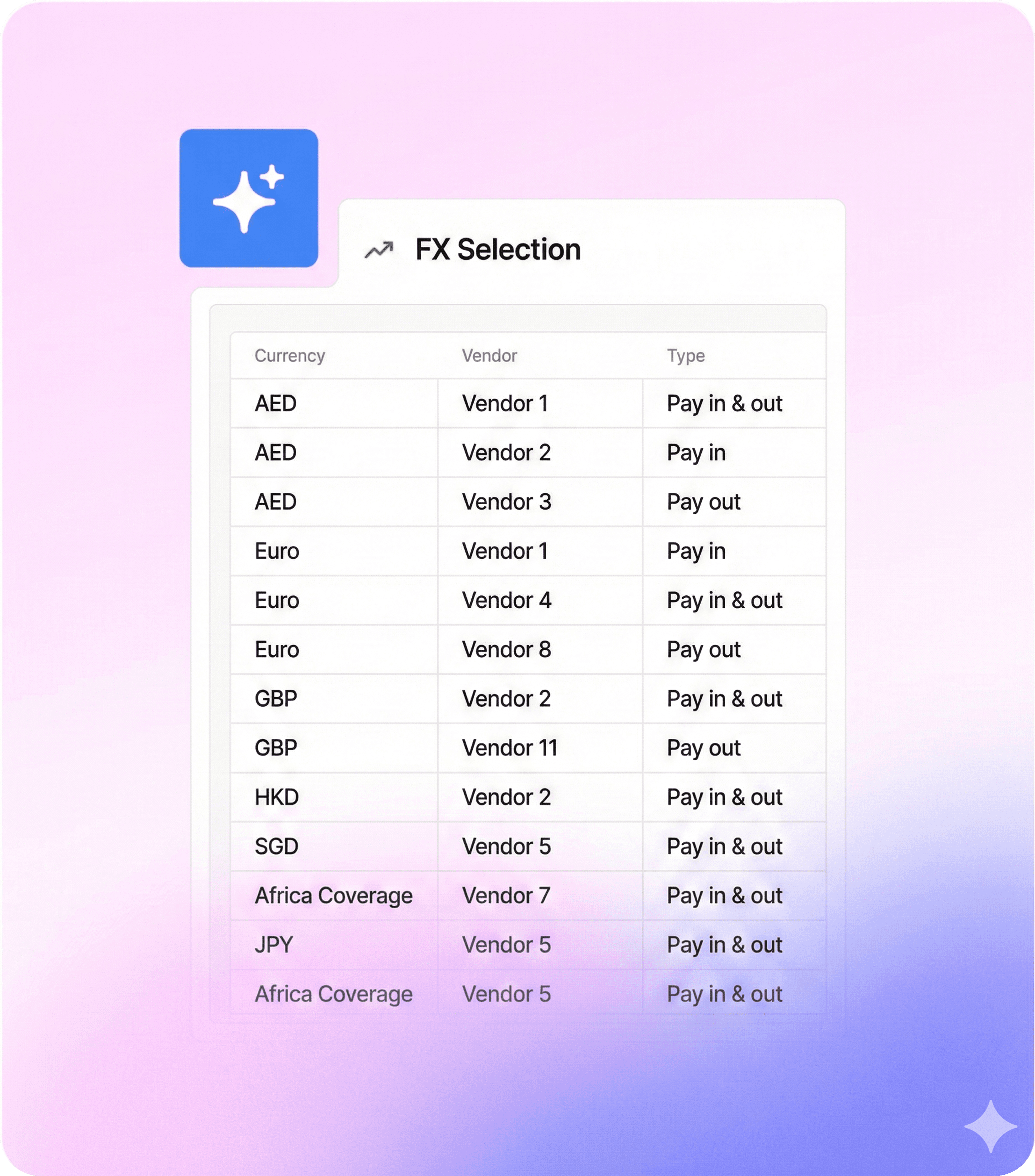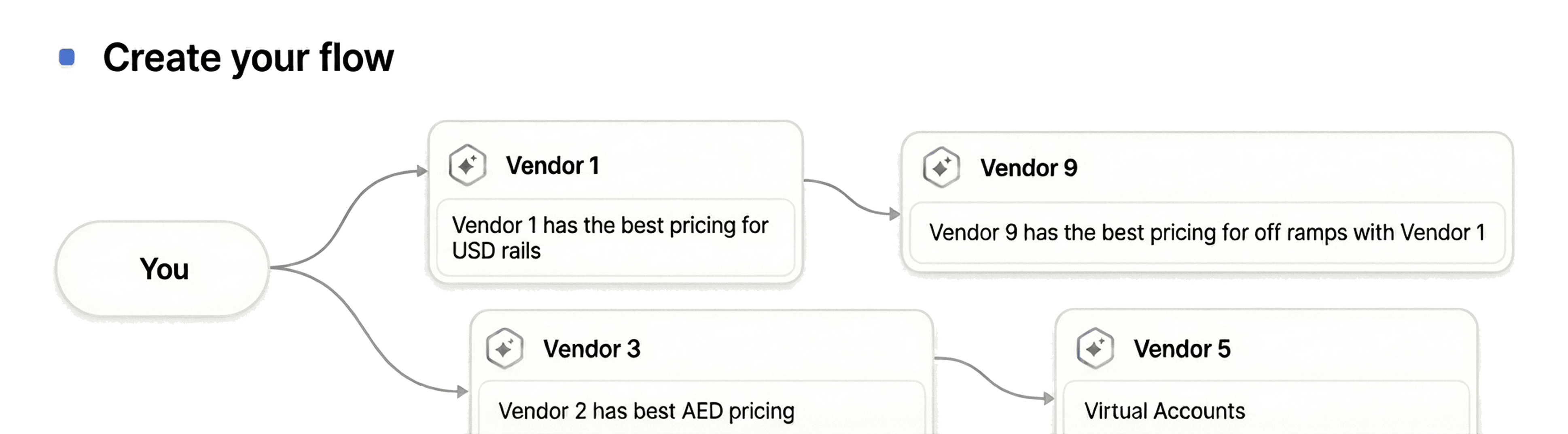 Select once and then automate from there the fastest, most cost-effective corridor. Optimizing for compliance, speed, and settlement across all rails with dynamic failover.