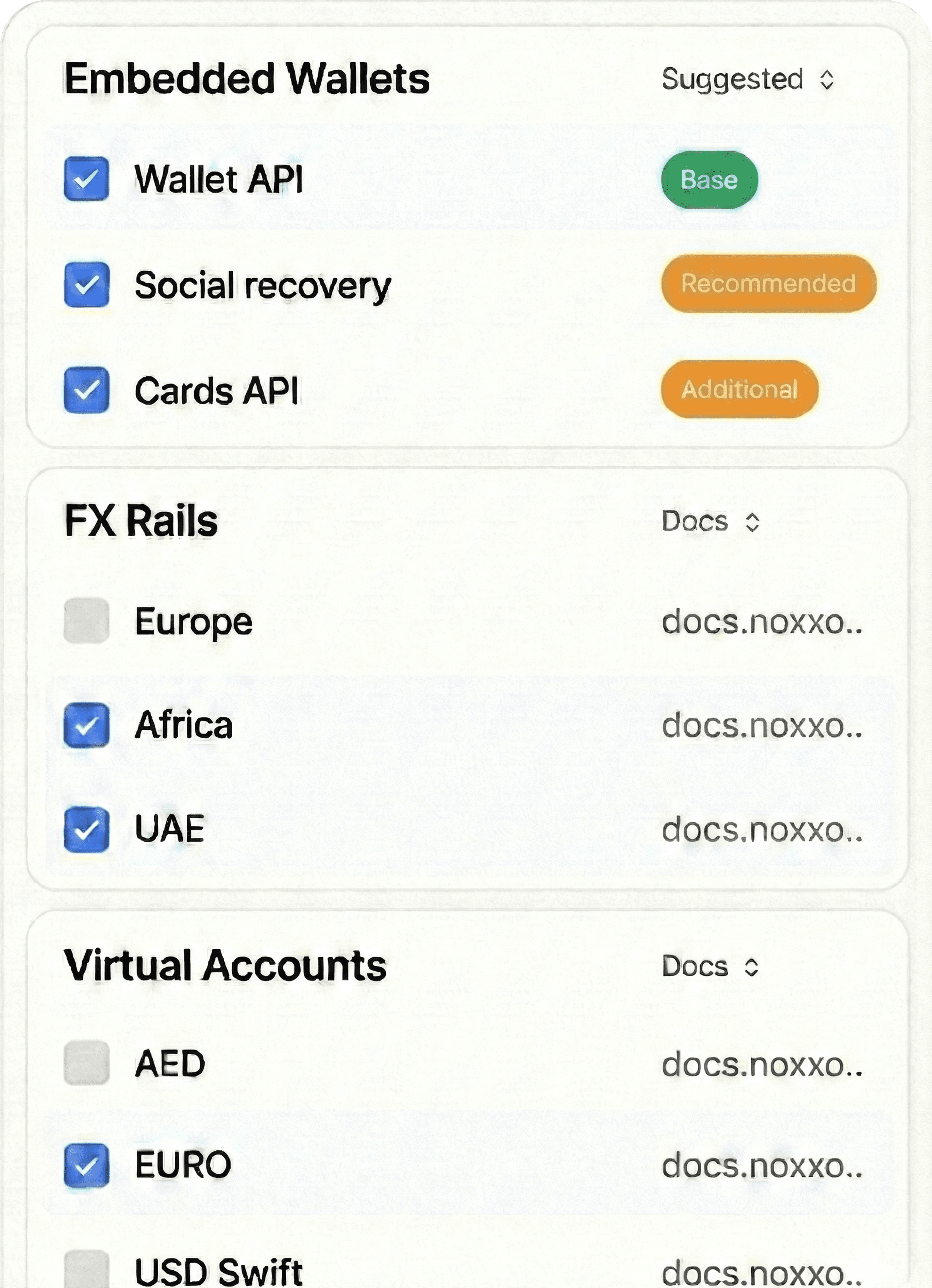 Integrate with licensed PSPs and VASPs (as applicable) with redundancy and security controls. Custody and regulated activities are performed by licensed partners; NOXXO provides the technical integration layer.